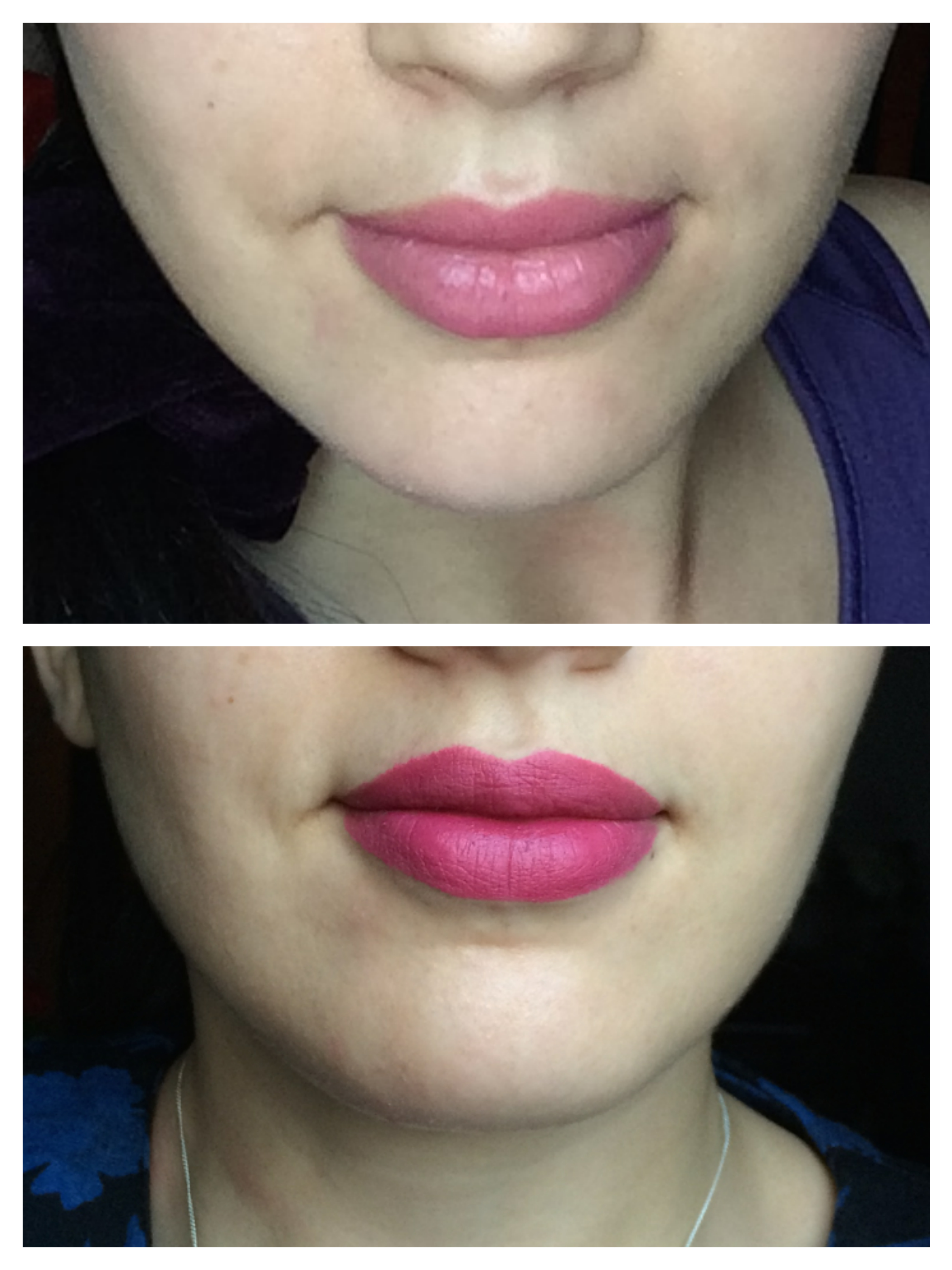 Ce qui est très bien avec ce genre de rouges, surtout s’ils sont dans des couleurs moins soutenues, comme celle que j’ai choisie, c’est que l’on peut les porter de deux façons différentes: soit en application légère, pour un effet nude, soit en insistant sur le raisin pour obtenir un effet intense et pin-up.