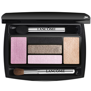 - Palette Hypnôse: 5 teintes de fards à paupières, de la plus claire à la plus foncée, vous permettant de réaliser des maquillages Nude comme des smokey intenses. Deux harmonies: une plutôt beige-rosé à nude et l’autre dans les tons dominants lilas. Je note toutefois que tous les fards sont irisés. C’est dommage, une base mate aurait été utile. A noter, les fards Lancôme sont de très bonne facture et conviennent très bien pour une longue tenue