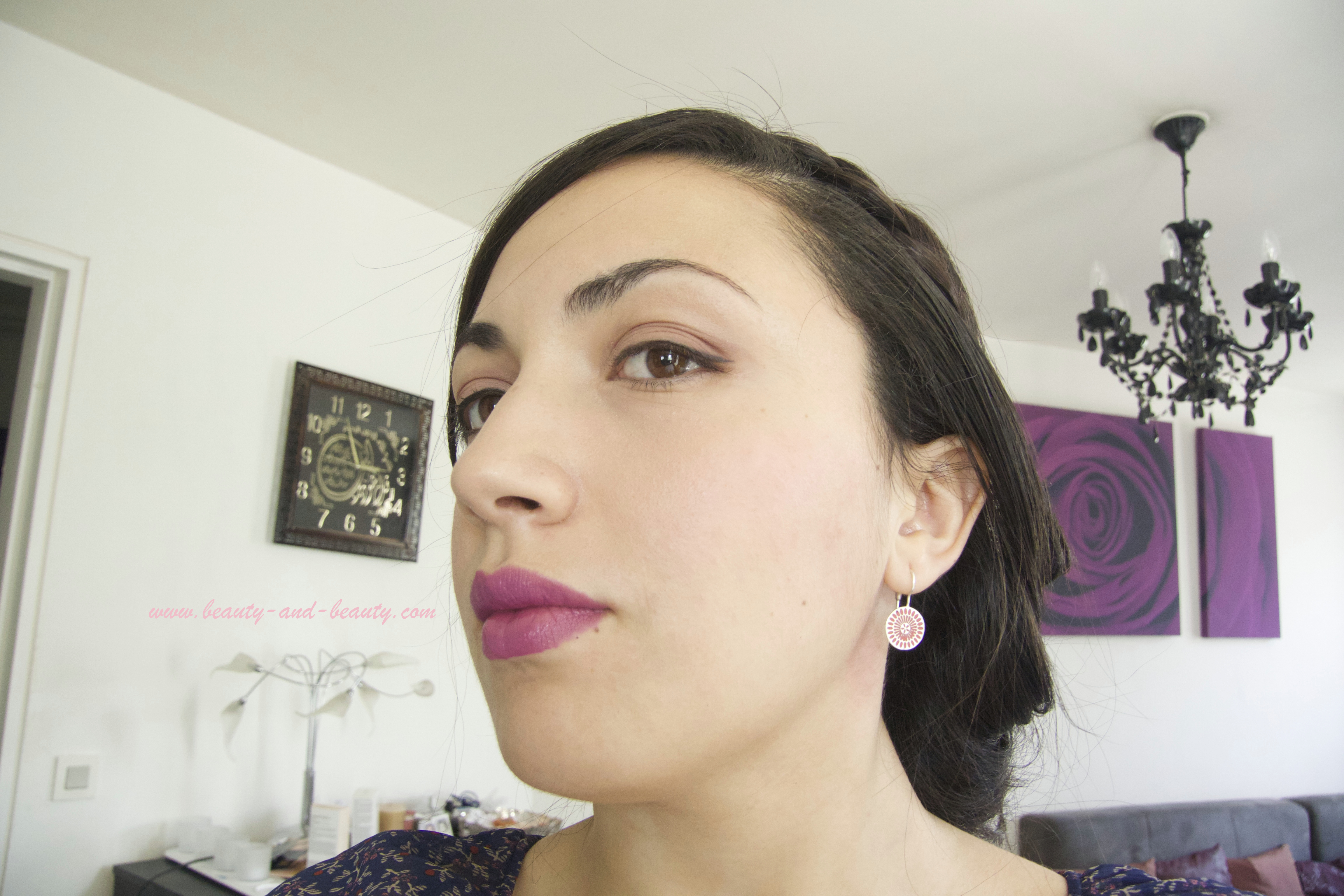 • Pour le fini, on parle d’un semi mat. Là, je ne suis pas d’accord. Comme vous le voyez sur les photos, il est bien crémeux et ça lui apporte une note de brillance qui n’est certes pas le résultat de nacres intégrés à la formule mais ça brille quand-même. Et de toute façon, mat et hydratation intense vont rarement ensemble. Mais ce n’est pas un problème, il est tellement facile à porter que je préfère qu’il soit ainsi