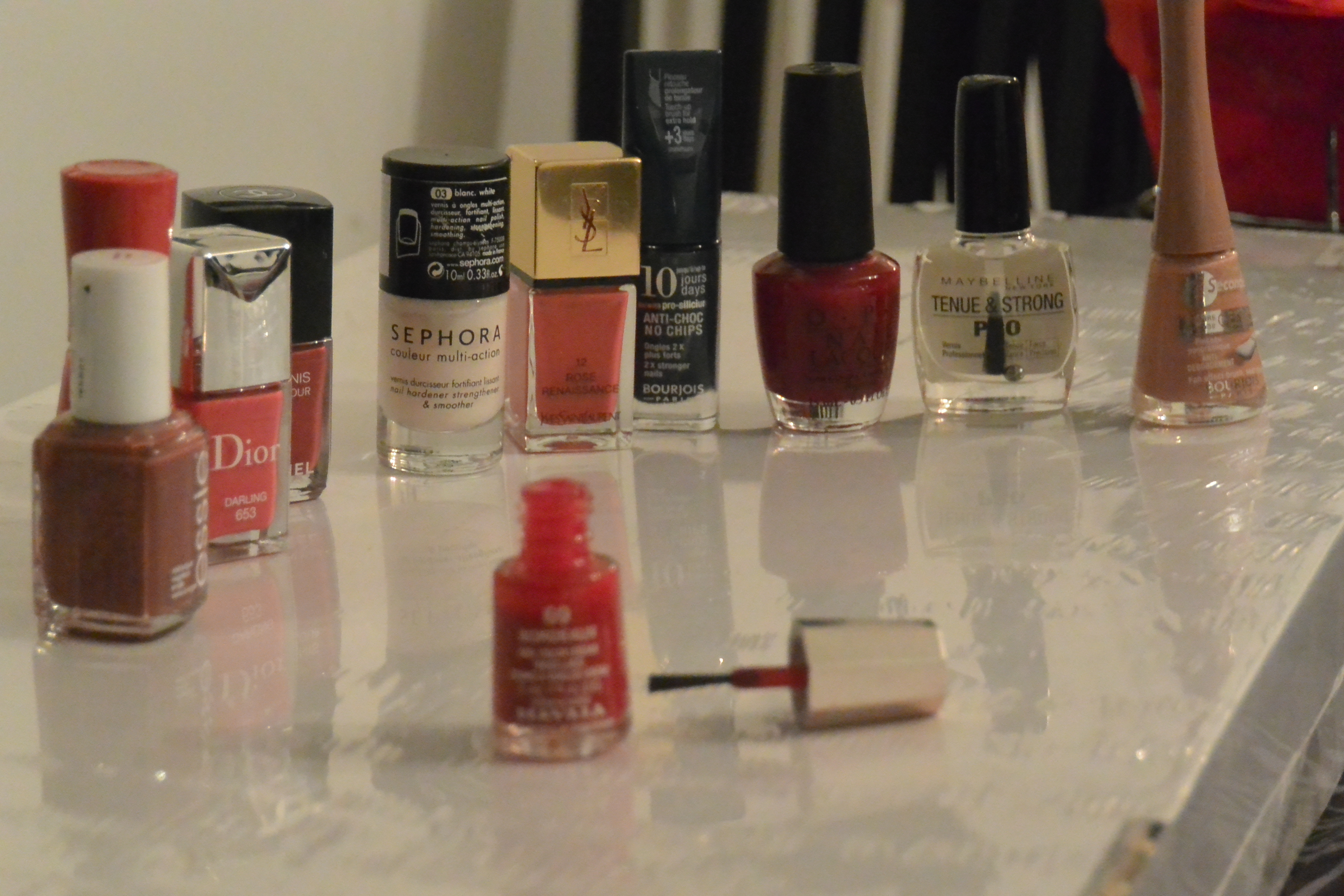 Commençons donc par faire un point sur ce qu’il y a dans mon placard: Essie, OPI, Bourjois, Dior, Chanel, Yves Saint Laurent, Mavala, Sephora, Nivea. Je n’ai pas de L’Oréal car je les ai abandonnés il y a quelques années à l’époque où les couleurs étaient un peu has-been et bling-bling. Depuis, ils semblent s’être améliorés, mais face à Bourjois, jusqu’à cette année marque du groupe Chanel quand-même (cédée à Coty depuis peu), ils ne font pas le poids. Pour le Nivea, c’est un craquage de vente-privee.com, donc je ne sais pas encore ce qu’il vaut.